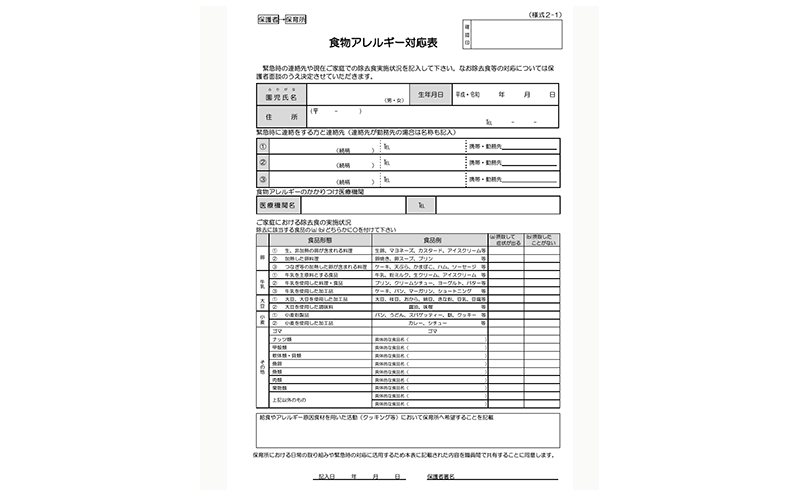 食物アレルギーのある子どもさんは、検査・診断を受けて所定の「アレルギー診断書」を必ず提出してください。